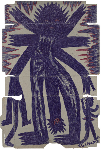 Guyodo Sans titre, sans date Stylo à bille sur carton d’emballage, 59 x 40,5 cm Image : Marie Humair, Atelier de numérisation – Ville de Lausanne Collection de l’Art Brut, Lausanne