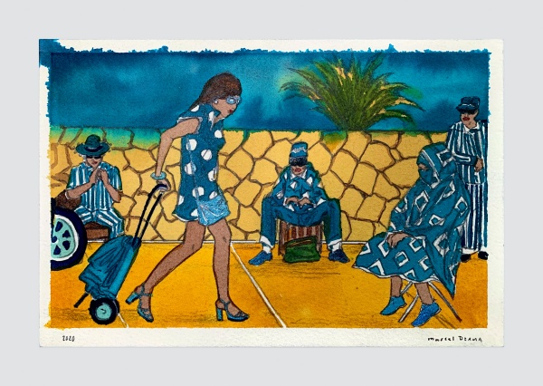 In 2018, invited by Louis Vuitton Editions to create a Travel Book, Dzama traveled to Morocco, visiting cities, seaside towns, mountainous villages, and desert communities. He charted a path that included stops in Tangier, Essaouira, Chefchaouen, Fez, Beni Mellal, Marrakech, and the Agafay Desert.