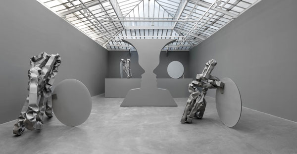 On view in the main gallery space are large-scale sculptures made of crumpled stainless steel tubing, each combined with a large, circular glass disk. Presented in a monochrome environment, the installation considers the phenomenological experience of form and the surrounding spatial context. The installation includes a three-dimensional construction of a “Rubin’s vase,” the well-known optical illusion first developed in the early twentieth century by the Danish psychologist Edgar Rubin. This ambiguous perceptual relationship relates to the paradoxes and ellisions at play in the overall installation between positive and negative space, and the apprehension of form versus gestalt. The adjacent galleries feature an installation of wall-mounted sculptures in colorful matte finishes that paradoxically render the steel tubing as if it were effortlessly malleable.