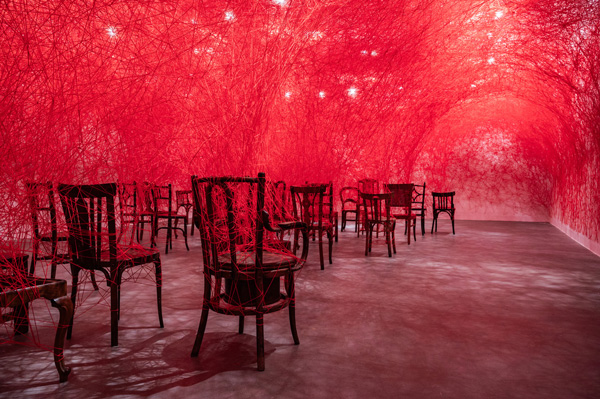 Through this project, Shiota reflects on the part of suffering in human existence. Symbolizing the micro-universe made up of blood and blood vessels that circulate through the body, her red threads, in the most literal sense, also make visible the mutual connections that bind humanity.