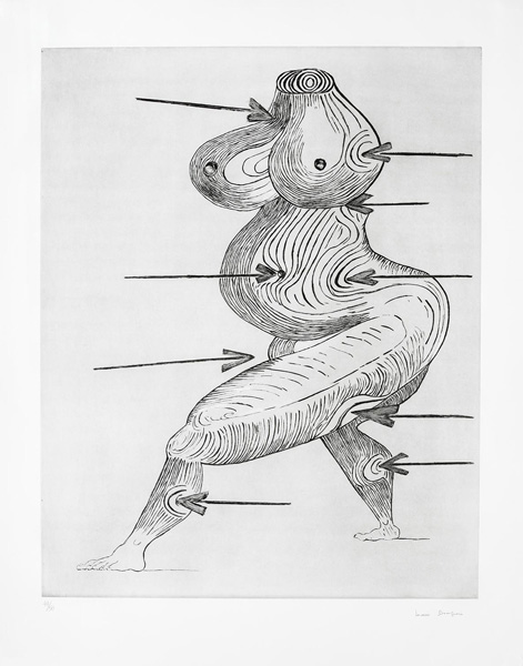 Woven together with numerous autobiographical elements, her work bears witness to a close relationship between memory and recollection that wavers, fades and stretches thin. Like her sculptures, with their shapeless, organic materials, her engraved work explores the ambiguity of the forms issuing from her fantasy-laced memories. This interplay of back and forth, conducive to the engraver's art, is particularly evident in her "Sainte Sébastienne", a feminine reinterpretation of the figure of the famous martyr pierced by arrows. In 1990, Bourgeois began the first version and would return to it several times, cropping the image, even using photocopying to develop her composition and/or transfer it to a copper plate.