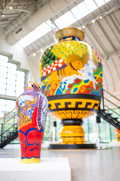 Roberto Lugo, Put Yourself in the Picture, 2022, mixed media, 240 x 144 x 324 inches, Courtesy of the Artist; Roberto Lugo, SAMO, 2022, ceramic, 46 x 18 x 18 inches, Courtesy of the Artist, photo: David Michael Howarth Photography