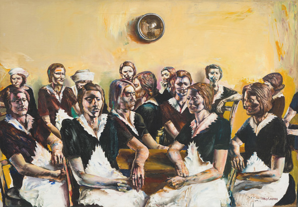 László Lakner, Seamstresses Listen to Hitler’s Speech, 1960 Oil on canvas, 70 × 100,5 cm Museum of Fine Arts – Hungarian National Gallery, Budapest (collection: Roberto Tosi)