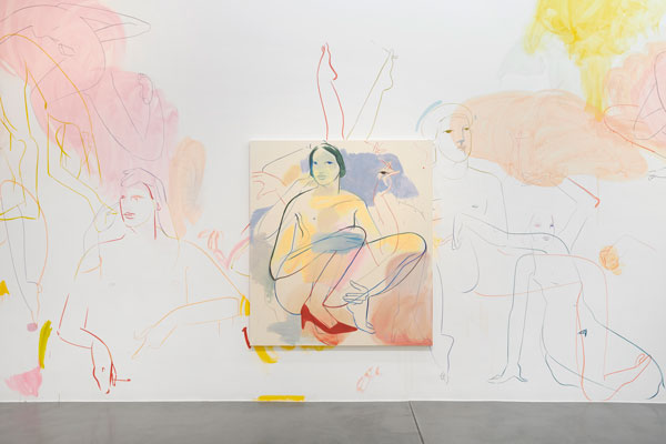 Her paintings are inherently sexual, but in a non-explicit and ambivalent way. The elegant pose of a thigh or the intertwining of bodies exude a languid sexuality that has not yet been consummated, the suggestion of pleasure enhanced by the paint spilling freely across canvas onto walls, floors and ceilings. Her figures are usually portrayed naked, whether in groups, in pairs or alone. Her abstracted figures suggesting both the strange intimacy of urban connection and the distance of city life.