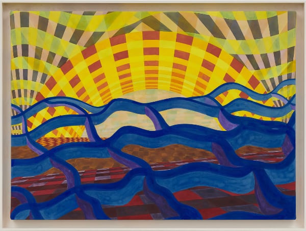 The exhibited watercolors, with some extremely large in scale, were exclusively painted in Italy. They testify to Held’s status as an exceptional colorist as well as a pioneer of hard-edged abstraction. Their colliding perspectives and impossible trajectories produce a feeling of vast and vertiginous volumetric expanse. It is as if the viewer was looking on the edge of an ever-receding, three-dimensional space in which sinuous ribbons thread through patterned planes and architectonic forms loom large towards the viewer with magical intensity.